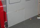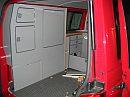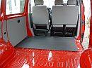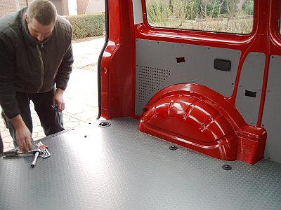 Hier der Beginn eines Innenausbaus eines VW-Busses T5 mit zum Teil vorgefertigeten Einbauteilen einer Fremdfirma. Einsetzen der Bodenplatte mit den Einbauelementen für die Sitzbankhalterung. |
